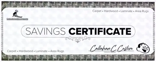 Saving Certificates are redeemable for purchasing flooring-based products at your local Custom Carpet Centers showroom in WNY. A Gift Card cannot be used to purchase other gift cards. Equally it cannot be redeemed for cash or credit. Prior sales excluded. No value until purchased. Not valid with builder or commercial accounts. Saving Certificate must be presented at time of sale. For additional information on how to redeem your savings certificate or inquire about balance information, please call your local Custom Carpet Centers showroom.